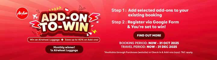 © 2025 AirAsia Berhad. This website is owned and operated by Move Travel Sdn Bhd (formerly known as AirAsia Com Travel Sdn Bhd) (201301020508), a registered travel agency (KPK/LN License No: 8287). Your usage of this website indicates that you agree to be bound by our